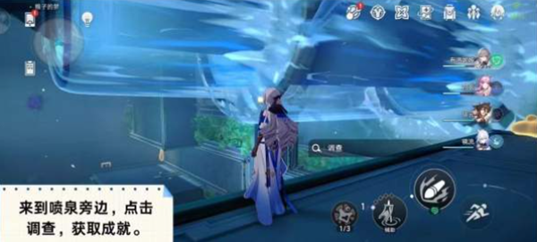 4、来到喷泉前方之后,点击调查的互动按钮进行调查,随后即可获得【重力泉成就】。