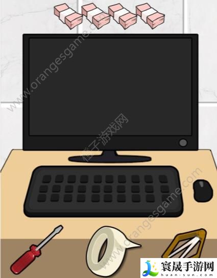 场景三:拖动螺丝刀给屏幕,拖动钱给屏幕,再拖动螺丝刀;点击屏幕亮起,再拖动钱、胶带给屏幕;拖动夹子给键盘再拖动钱至键盘;