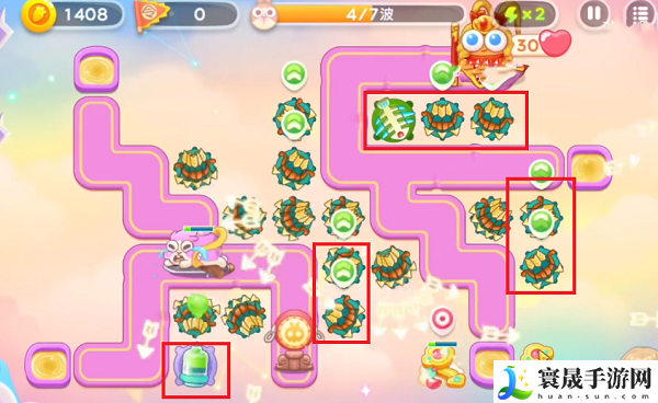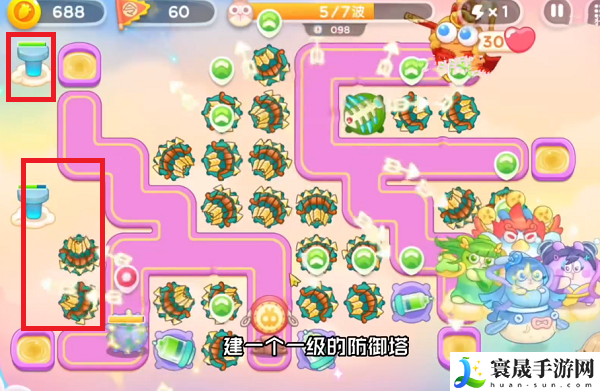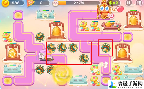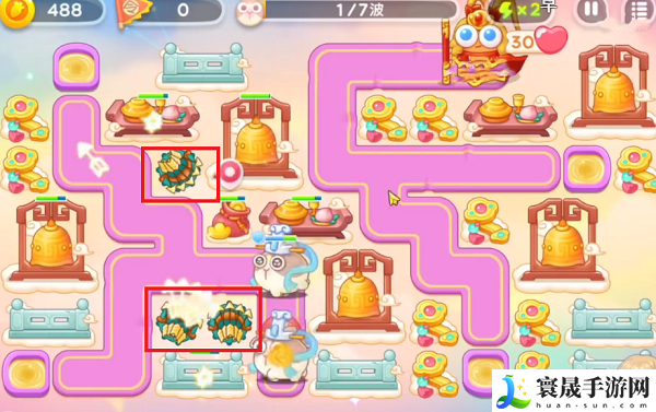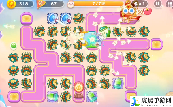 1、开局造两个弓箭升满级,下方打掉道具后加弓箭,也升到满级,解决完第一波全部粉兔后,锁定钱袋。