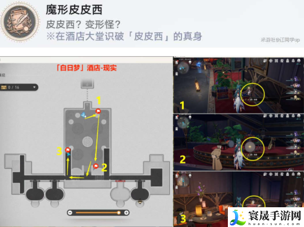 1)将下图3个位置依次【调查】一遍,找到3次变身隐藏起来的皮皮西后,就能获得【英雄】贴纸了,同时获得成就《魔形皮皮西》,属于【与你同行的回忆】