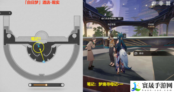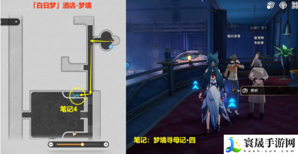4)接着来到【「白日梦」酒店-梦境】下图位置【旁听】后,获得【笔记:梦境寻母记·四】