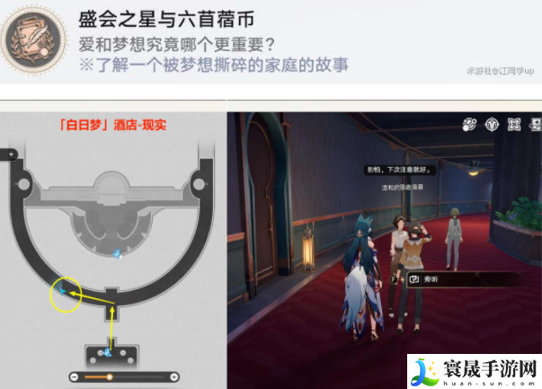 5)最后再来到【「白日梦」酒店-现实】下图位置【旁听】后,就能获得【女儿】贴纸了,同时获得成就《盛会之星与六苜蓿币》,属于【与你同行的回忆】