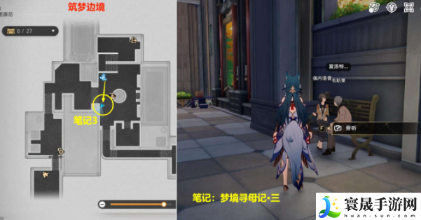 3)接着来到【筑梦边境】下图位置【旁听】后,获得【笔记:梦境寻母记·三】