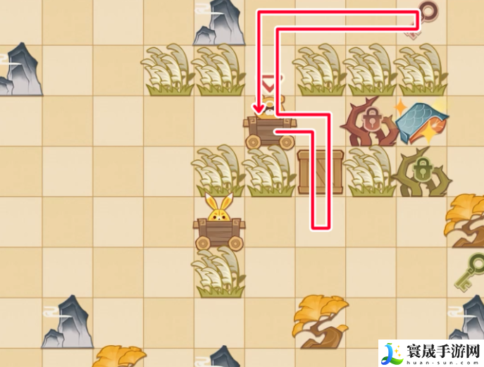 第2步:锅巴向右1步,向下2步,推动木箱,之后向上2步,向左1步,向上2步,向右3步,拿到红钥匙,最后向左3步,向下2步,回到小车;