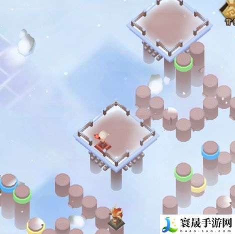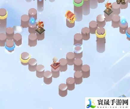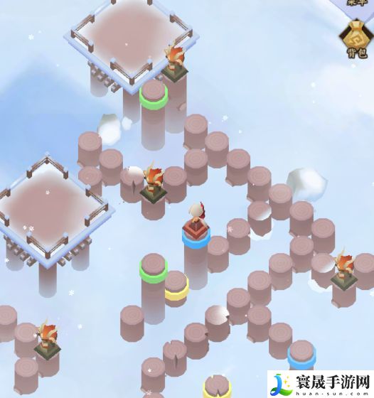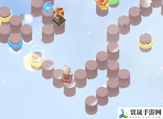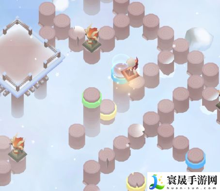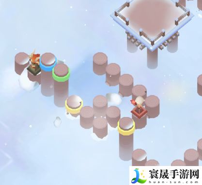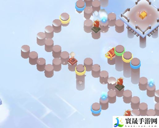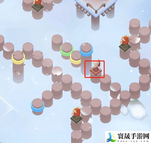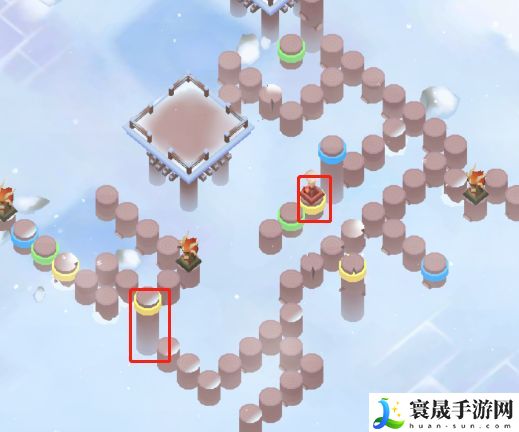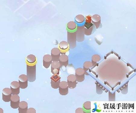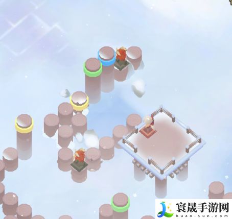 然后如下图所示,我们需要注意的是,需要踩到中间的黄色柱子上,保证图片左侧的黄色柱子是升起的状态,为后面打通路。