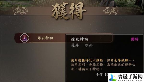 嫁衣神功:使用后获得40六维点,但角色等级扫一。