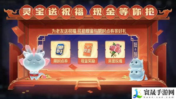 【灵宝祝福】活动入口也位于活动中心-一聚成龙,活动时间为2月6日逐步开启至2月19日前可参与,2月20日至2月25日可继续领奖。参与活动的玩家可以通过发送和领取灵宝群祝福红包,以及给老朋友发送英雄视频祝福,来获得各种奖励。