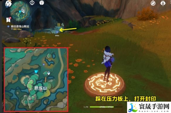 踩压力板,解开洞口封印。(如果另一块压力板上的仙像移走了,用岩造物替代也行)