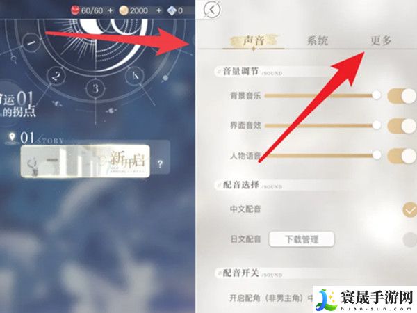 1、打开光与夜之恋游戏界面,点击右上角的设置图标,点击“更多”按钮。