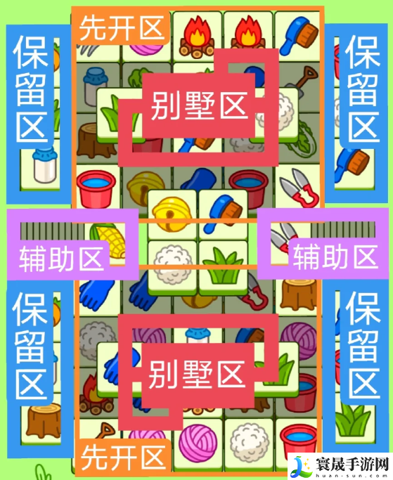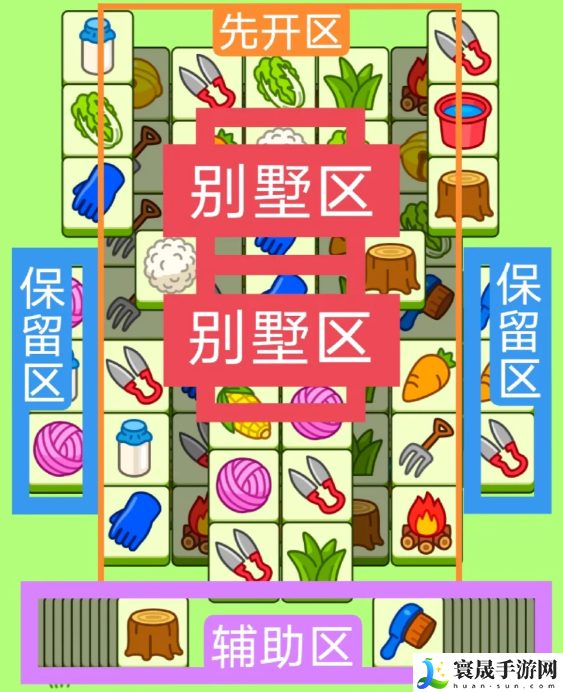 两个十字形大别墅组成,开局我们先消除橙**然后按照一层层均匀消除表面牌。哪里压牌较多就先消除哪里。必要时可以用盲盒区辅助消除表面牌。尽量还是以别墅区内互相消除主。蓝**有叠牌,但是不多。全部保留到后期使用。
