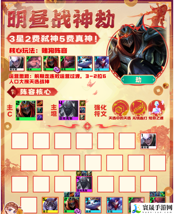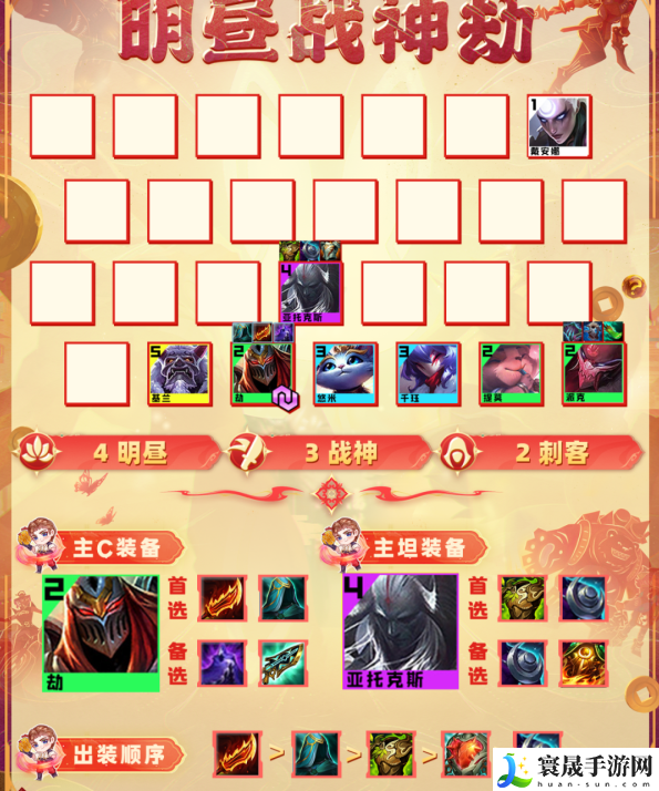 1.金铲铲之战明昼战神劫阵容组成:皎月、劫、提莫、悠米、派克、千珏、剑魔、时光、奥恩