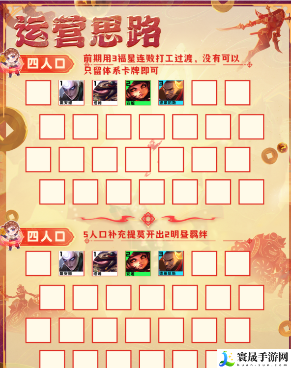 (3)悠米的技能效果是生命值最低的英雄,然后飞到最远的英雄,因此悠米的站位可以考虑放在生命值最低的英雄旁边,以及跟劫对角站位
