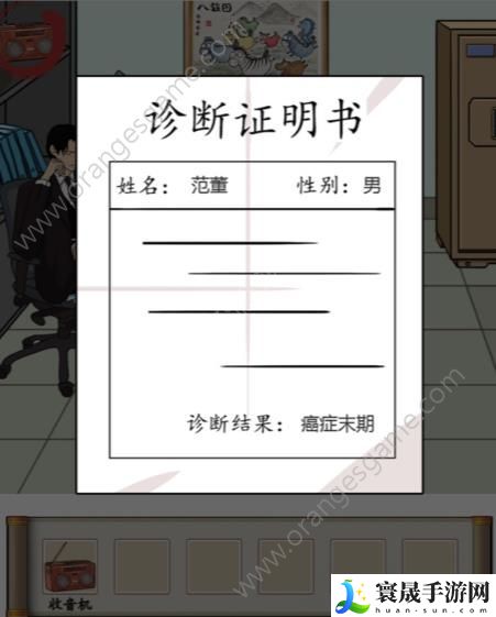 第一步:我们先到书房内点击收音机、*桶能发现病历,还有男人屁股下方的简历;