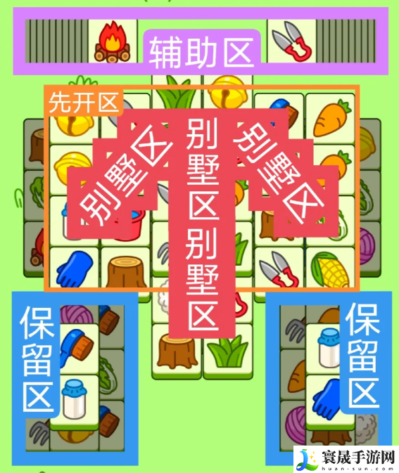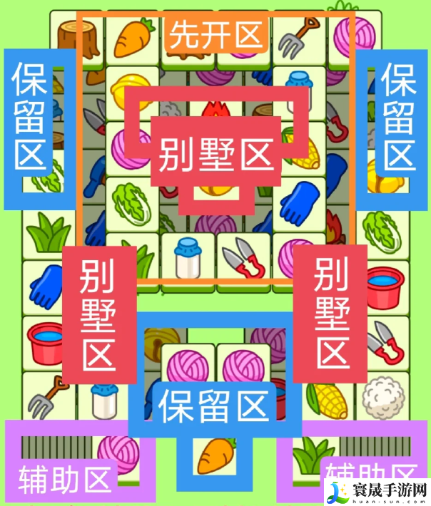 两个长形大别墅,两个斜着的长型大别墅开局先消除橙**然后按照一层层均匀消除表面牌。哪里压牌较多就先消除哪里。必要时可以用盲盒区辅助消除表面牌。尽量还是以别墅区内互相消除主。蓝**有叠牌,但是不多。全部保留到后期使用。