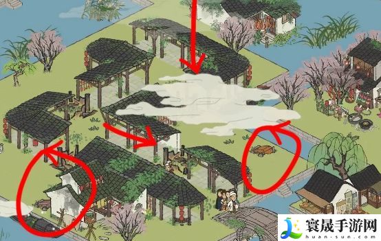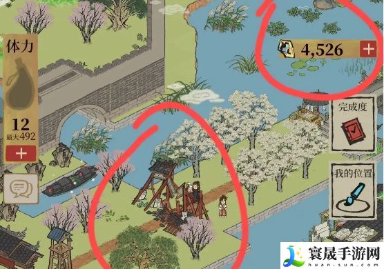 2、铜鹤相对,需按下图红箭头指引除去百合花和紫叶李到达铜鹤,其中所需玉山果需点击下图标出的发光乌篷船,可额外获得补天石;