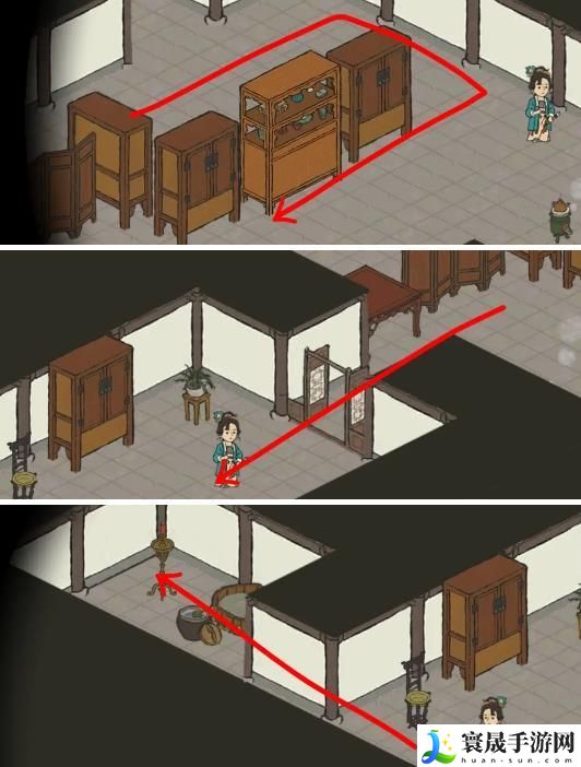 3、城中三个人物对话,第一个人物按箭头除去牡丹花,通过走廊到达人物,顺便找到第一个宝箱;