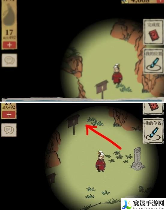 4、找杨梅看起来较难,其实很简单,到处走走总能找到,要找树上结红果的杨梅树,点击巨石或者杨梅树会缩小视野范围,其中发亮的地方是石碑可恢复视野,大概在原始位置左上角一点;