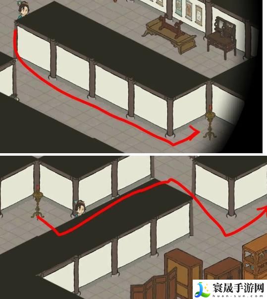 9、烛台这里比较难点的,点了很久,找完后用箭头从原始位置到第一个烛台再到第二个烛台给大家标出来了,写信位置就在原始位置;