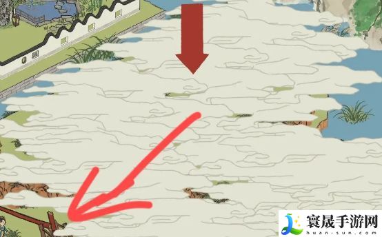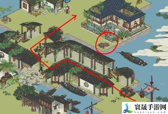 1、与董其昌对话需点击人物面前木门,再铲除三月泡即可到达,人物后面的发光乌篷船可点击,会得到玉山果和补天,玉山果后面会用到;