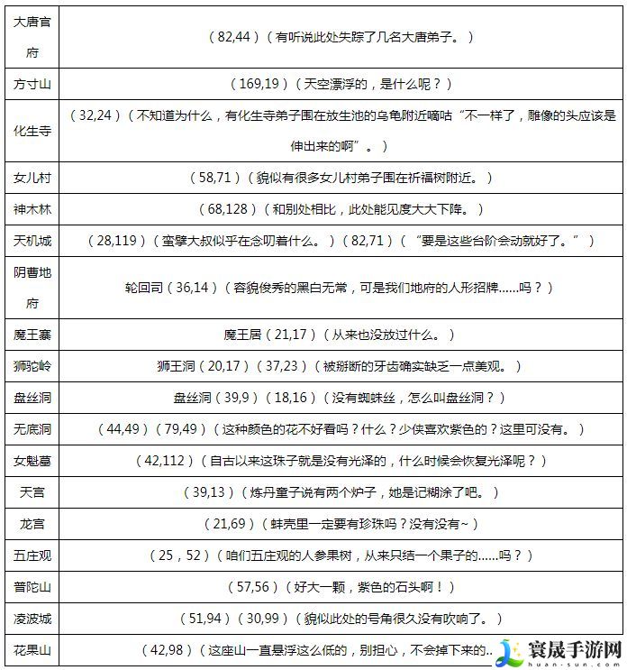 各大天命门派场景中存在异样的坐标如下表所示,注意奇遇门派并没有异样。