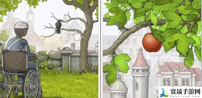 最终目标,左上角乌鸦踢下右上角苹果使苹果掉右下角碗里,只要画面对上(接缝连接)自动触发,触发后引导孩子前进并动过调整门洞位置进入花园。