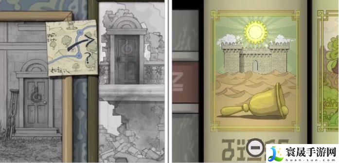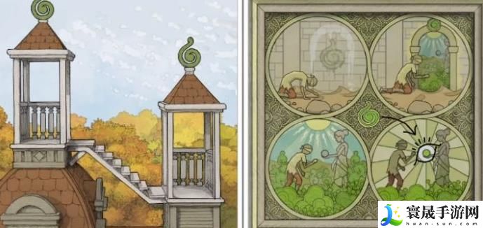 然后进入窗户层桌子上的中间的铃铛神器,用睡觉男孩后背的中间那本书结合金星的齿轮旋转起来,旋转到朝阳朝下(逆时针90度),点击白昼那个圈进去,与端盆小孩图景连接上,然后拖动门洞到下一幅,小孩可以进入下一幅画了,然后进入右侧的神器,把花玻璃的空洞和推车轮子结合,转动三次后,进入花玻璃下面的图景,里面有门和楼梯(楼梯在下面就对了,不对在轮子那里继续转),然后接在端盆小孩那里继续前进。
