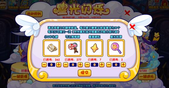2、完成今日的点亮任务后就找自己目前需要的兜兜星或者拢月猪星进行道具提交,每天仅可提交一次,一次最多提交10个道具,小洛克们可以种植小Q牛轧糖和可达棒棒糖进行凑数,有可能一天没有掉落够10个活动道具的。