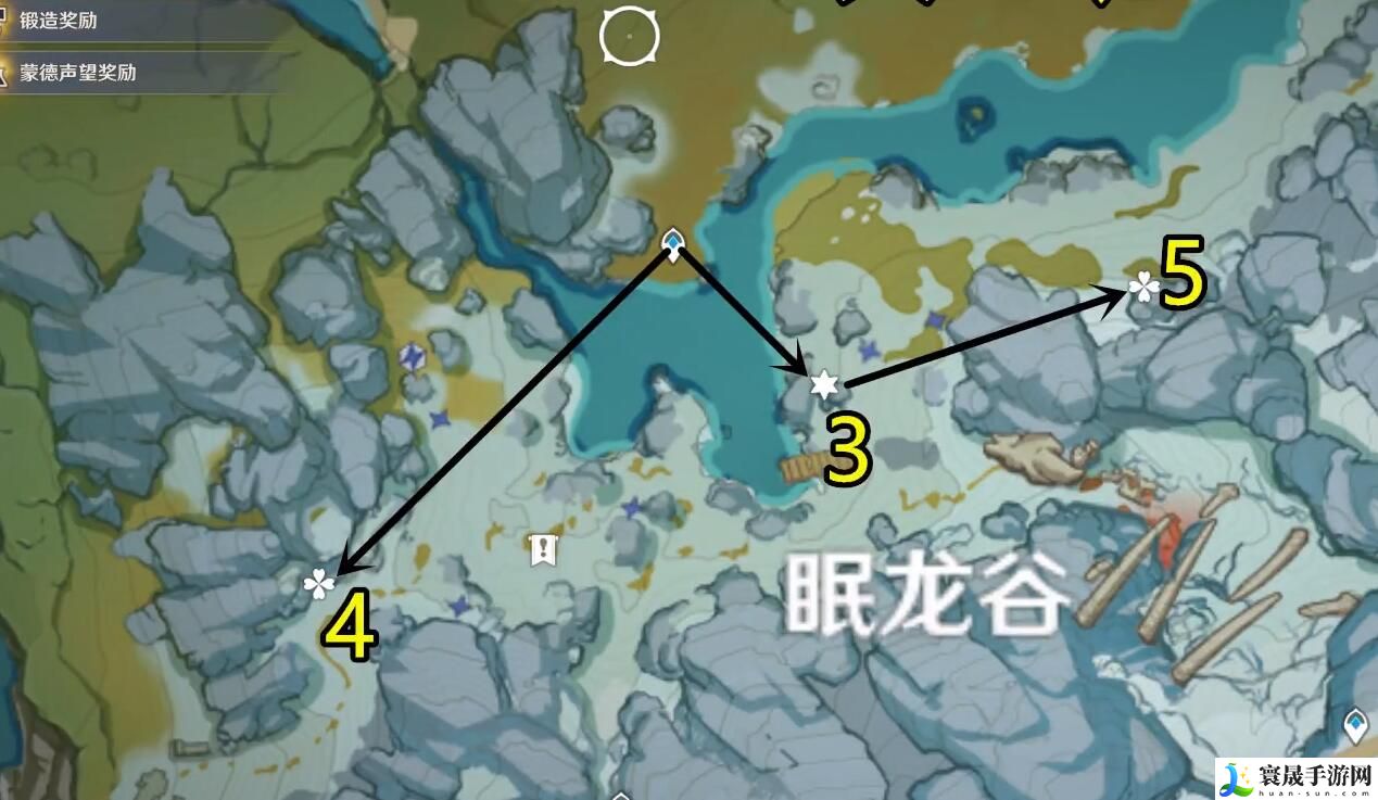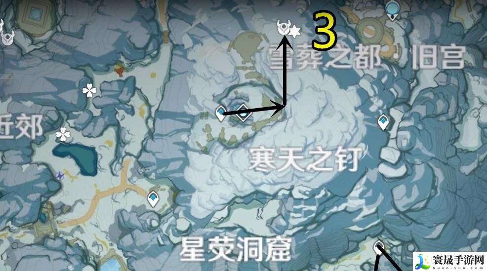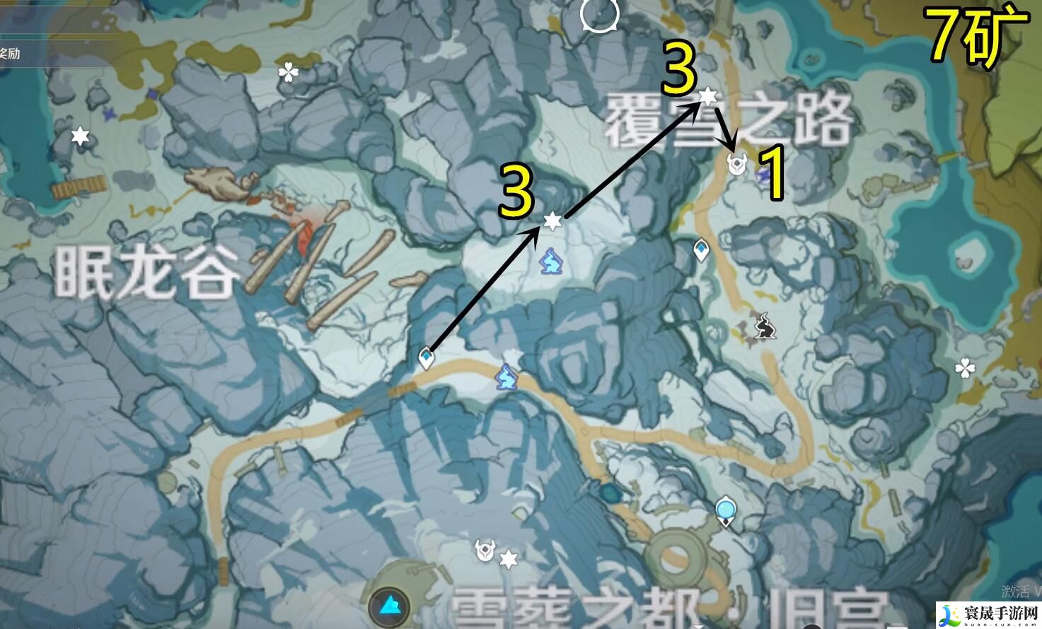 3、覆雪之路传送点,七个矿;