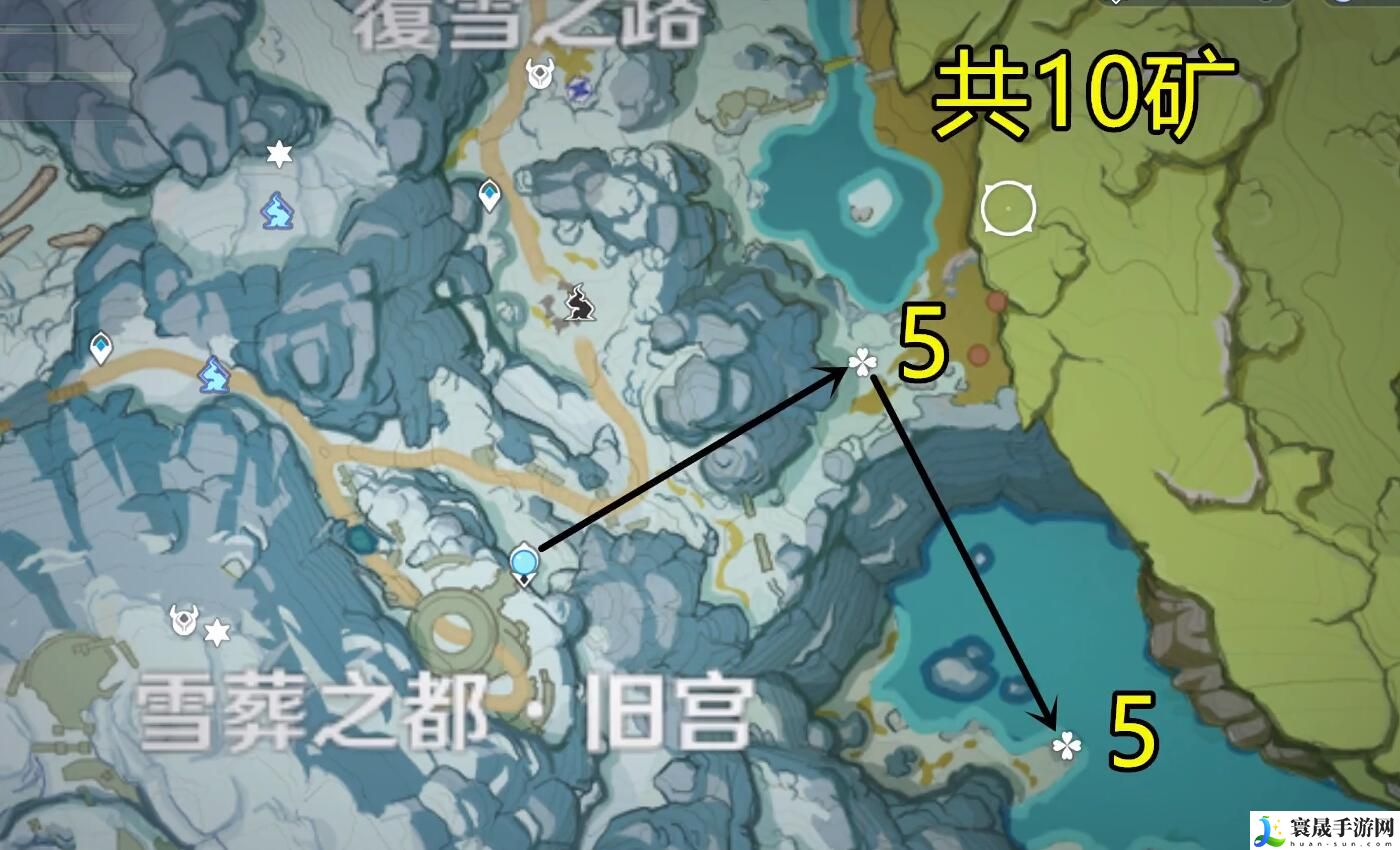 2、雪葬之都旧宫右边,十个矿石;