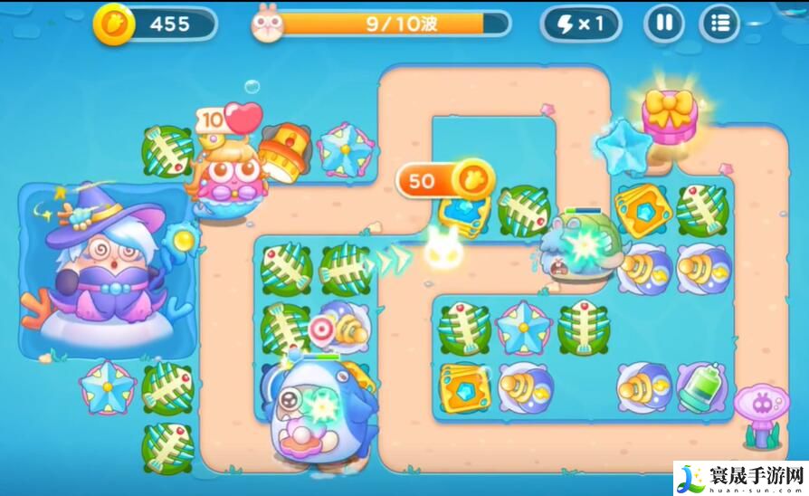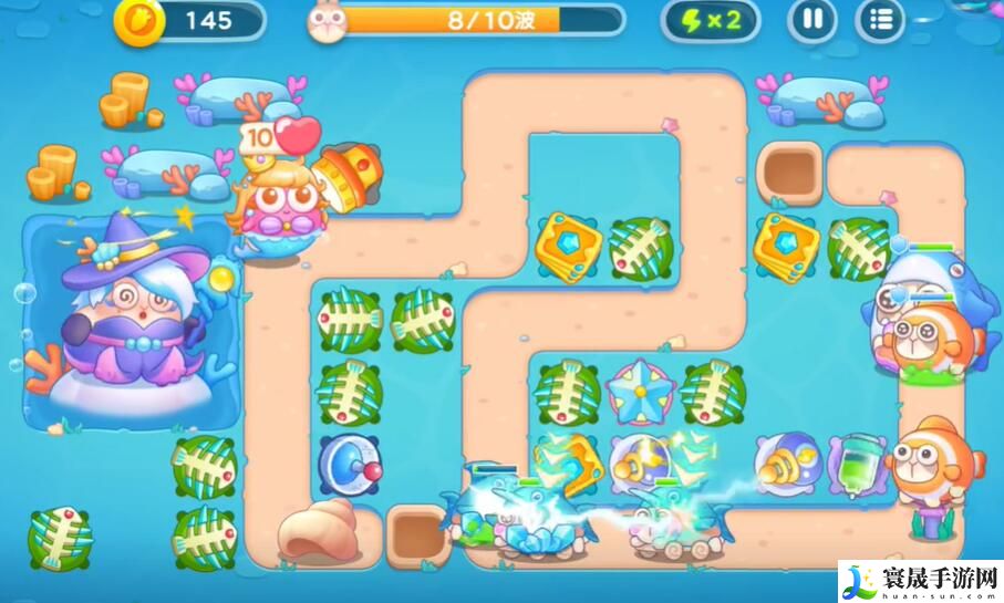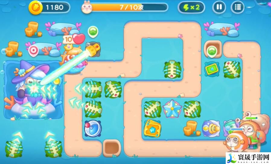4、通过击破宝箱获得各种防御塔,同时建造更多的鱼骨塔对各种类型的障碍物进行清理。