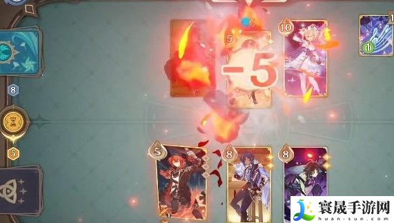 1、我们是万能元素骰所以可以随便使用技能,迪卢克先打一个三费的战技给安柏造成3点伤害,安柏会固定放大招;