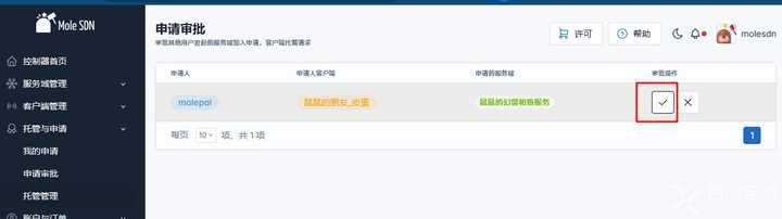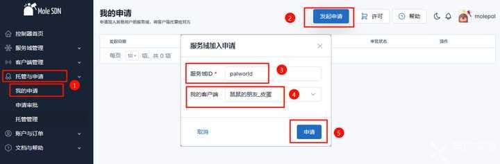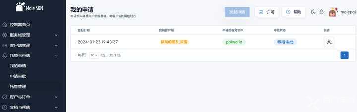 20、回到服务域管理页,将幻兽帕鲁服务器以中心模式绑定至服务域,联机好友只需在自己电脑上运行MoleSDN客户端登录自己的账户(本文示例为:molepal,用户可自行注册),前往SDN控制器-授权管理-我的申请 (molesdn.com),发起申请即可;