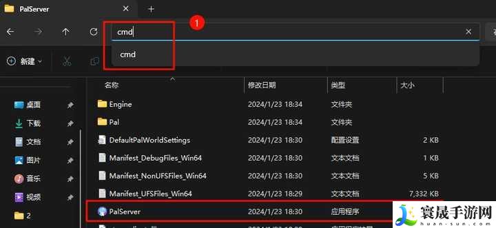 8、在palword app下载完成后,可以在steamcmd的steamappscommonPalServer 目录找到名为PalServer的应用程序,此时在文件路径内输入cmd,以当前路径环境打开命令行窗口;