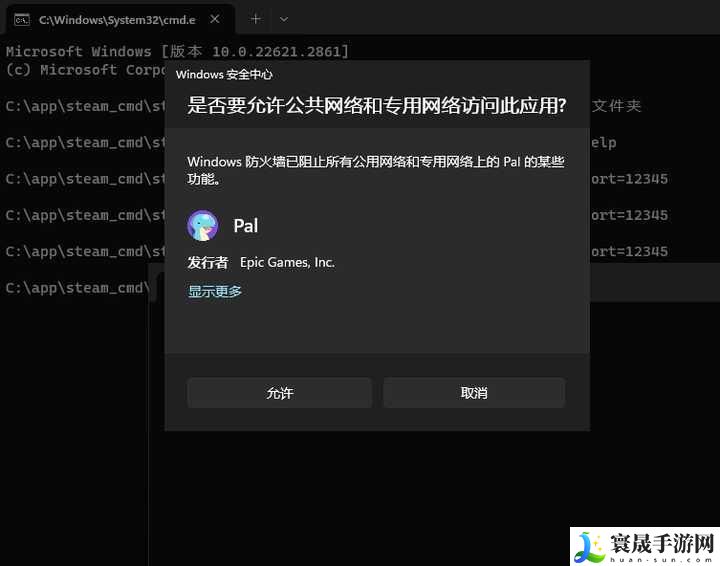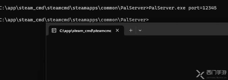 9、在steamcmd中进入steamappscommonPalServer文件夹,打开cmd命令行窗口,在命令行中输入 PalServer.exe port=12345;