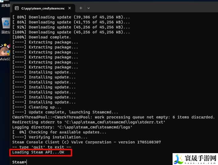 5、出现Loading Steam API...OK,表示下载更新完成,请不要关闭窗口后续会用;