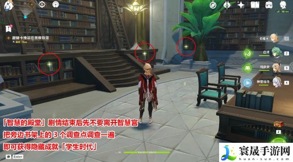 在通向第4个结局的路线中,做到剧情「智慧的殿堂」这一段时,在我们与卡维和艾尔海森对话结束后,卡维邀请我们一起去奥摩斯港看看。这时先不要离开智慧宫,在我们旁边的书架上,有三个闪光调查点,分别是三本书籍,将这些调查点全部调查一次即可获得该成就。