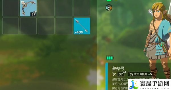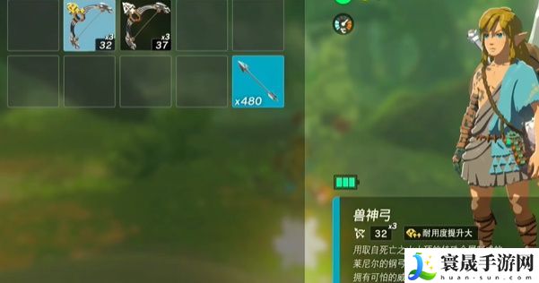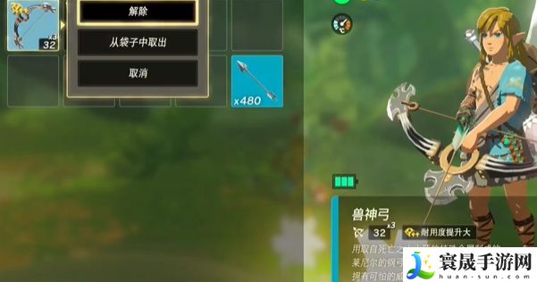 3、第三步,按加号进入菜单,把当前装备的弓选择从袋子里取出,然后装备第二把弓。