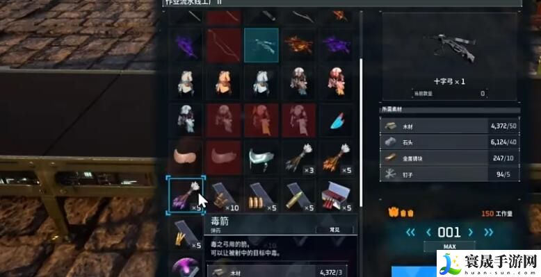 50*木材、50*石头、15*金属铸块、5*钉子、5*毒腺