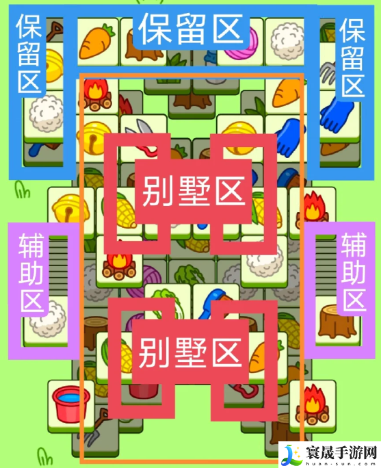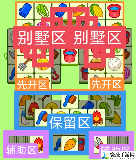 两个麻花形大别墅组成。开局先消除橙**然后按照一层层均匀消除表面牌。哪里压牌较多就先消除哪里。必要时可以用盲盒区辅助消除表面牌。尽量还是以别墅区内互相消除主。蓝**有叠牌,但是不多。全部保留到后期使用。