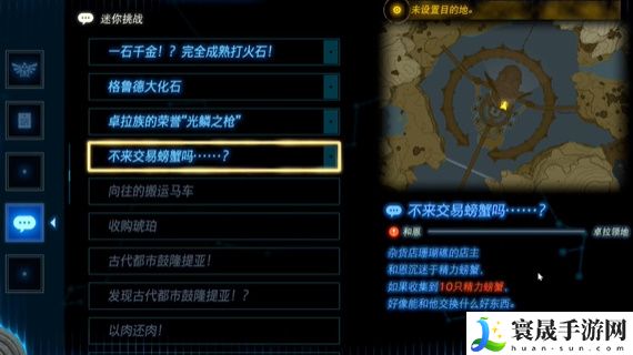 塞尔达传说王国之泪不来交易螃蟹吗需要我们找到和恩然后跟他对话了解详细,接下来就可以接到这个迷你挑战任务了,接下来我们就需要去找到一些螃蟹用来与和恩做交易,当然和恩也会出示对应的一些商品!