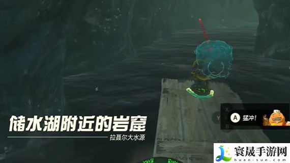 3、然后玩家到达船上后是开始往洞窟中移动,进入洞窟中是会提示这里是储水湖附近的岩窟,到达里面的岸上后下来。