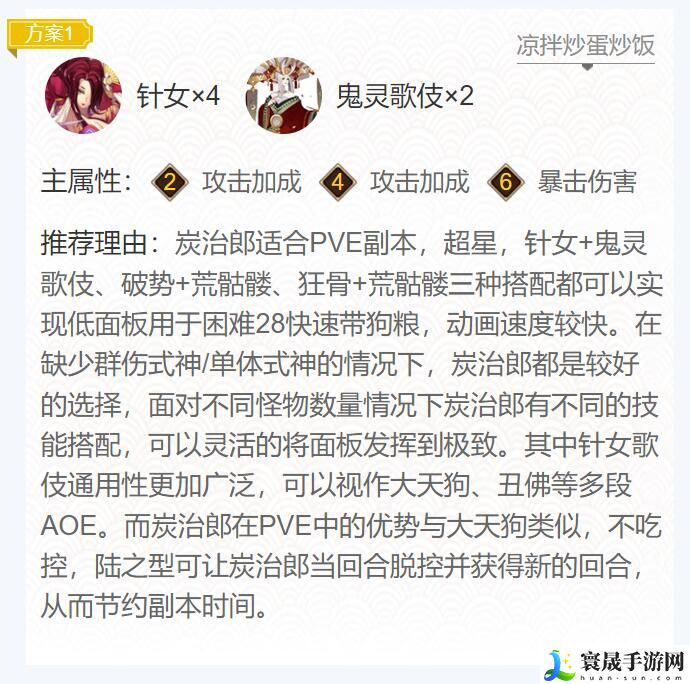 炭治郎适合PVE副本,超星,针女+鬼灵歌伎、破势+荒骷髅、狂骨+荒骷髅三种搭配都可以实现低面板用于困难28快速带狗粮。其中针女歌伎通用性更加广泛。