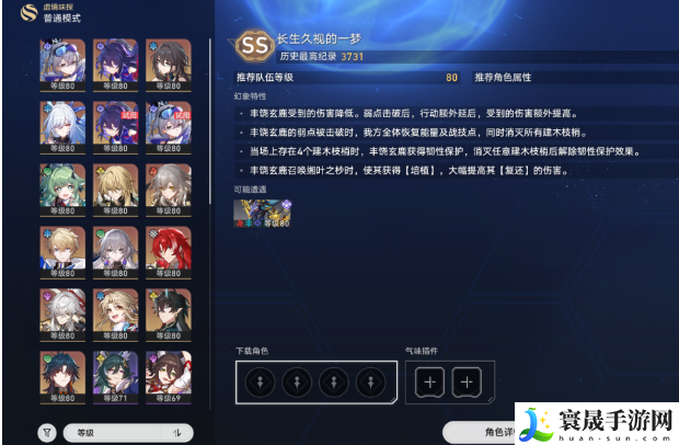 本次关卡共有四个幻想特性,总结起来就是被弱点击破后的丰饶玄鹿会给我方提供大量能量和战技点,并且使丰饶玄鹿的受到的伤害得到提高;丰饶玄鹿在场上有4个小怪时锁弱点,小怪不够会补全。本次提供希儿+银狼双量子组合试用。希儿战技和终结技能够提供额外回合,银狼提供削减防御达到增伤效果。对于攻打丰饶玄鹿削减韧性条有很大的帮助。