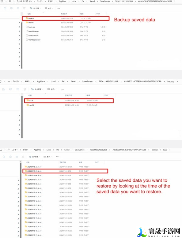 3、打开文件夹,可以看到正在使用的玩家与世界的存档,打开【backup】—【local】文件夹,找到想要备份的存档时间所对应的文件夹;