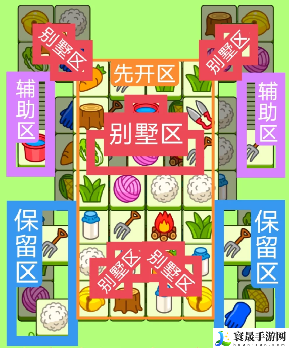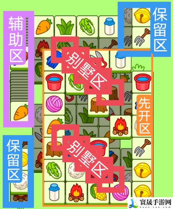 两个斜着的长形大别墅组成。开局先消除橙**然后按照一层层均匀消除表面牌。哪里压牌较多就先消除哪里。必要时可以用盲盒区辅助消除表面牌。尽量还是以别墅区内互相消除主。蓝**有叠牌,但是不多。全部保留到后期使用。