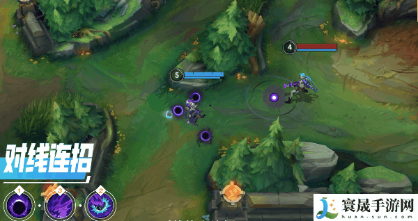 对线期,我们需要利用Q(1)技能可操控的机制,优先使用Q(1)技能起手造成伤害,同时施放E(3)技能衔接控制效果,最后再利用W(2)技能补足伤害,凭借减速效果后撤出敌方攻击范围,完成对线换血连招。