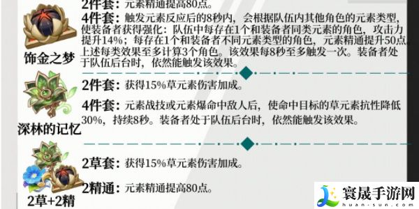 圣遗物选择上以提升精通的圣遗物为主,目前能提供较高精通的圣遗物就是饰金之梦了,一般海森配队都是双草配队那么就能提供14%的攻击和180的精通加成。在4件套还未成型之前可用2+2过渡,乐团,饰金,深林,随意搭配那个副词条好就用哪个,深林四件套仅在单草配队时使用,双草配队一般以另一个草系角色携带深林套提供减抗艾尔海森携带饰金套。