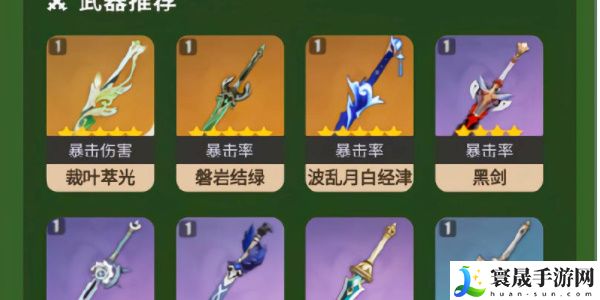 五星武器的推荐上以专武裁叶翠光为首,其次考虑其他的五星武器,四星、三星武器仍然是优先考虑双暴加成,其次精通,因此可以选择铁峰刺、东花坊时雨、西福斯的月光等,黎明神剑这把三星武器很容易就能满精,副词条就能提供46.9%的暴伤被动效果还能提供28%的暴击加成非常适合艾尔海森的平民武器。