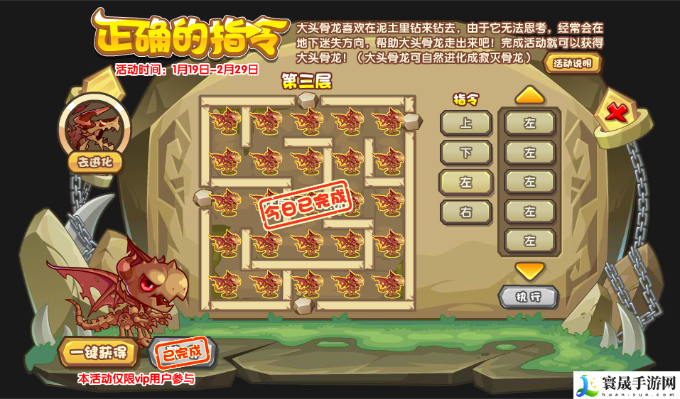 当完成三层的挑战,就可以领取一只:大头骨龙!本活动为VIP专属。