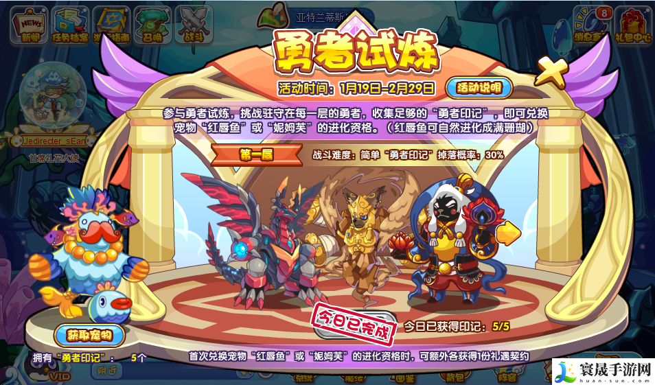 拿到足够的勇者印记就可以获取宠物啦!红唇鱼:8枚勇者印记、妮姆芙进化资格:12枚勇者印记。